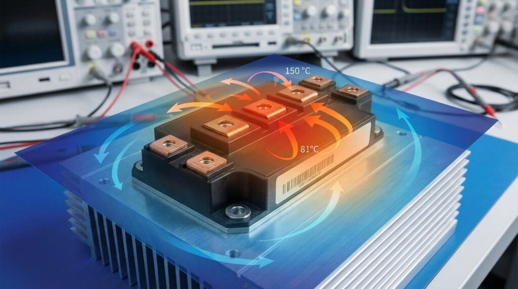 A gestão térmica é o pilar da confiabilidade em eletrônica de potência. O parâmetro Rth(j-c) (Resistência Térmica Junção-Carcaça) indica a dificuldade que o calor encontra para fluir do chip de silício (junção) até a base do módulo (carcaça).