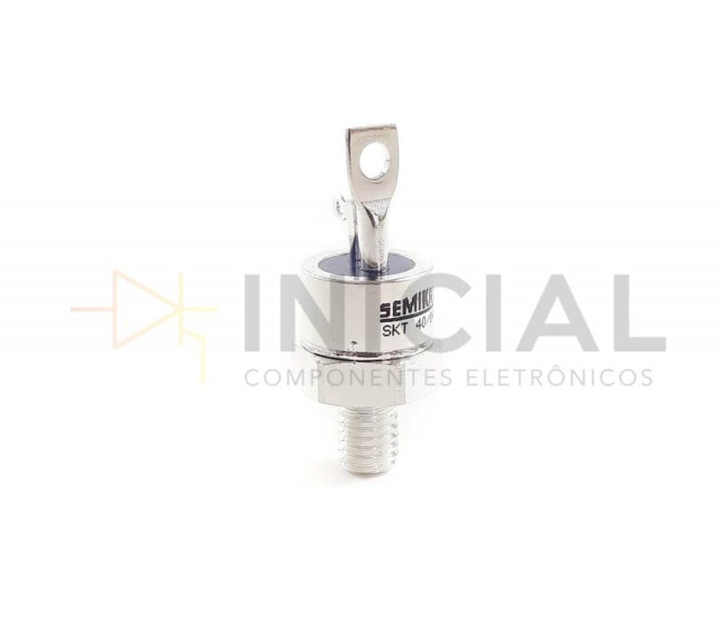 O SKT 40/12E é um componente eletronico da família dos semicondutores, por ser um tiristor possui o objetivo de conduzir a corrente em um único sentido, porém, diferente do diodo é possível conduzir a corrente através de um disparo/pulso em seu gate permitindo o chaveamento de altas potências em elevada velocidade. Também conhecido por diodo de 4 camadas (p-n-p[gate]-n), são amplamente usados em eletrônica de potência.Em relação ao disparo em seu gate, caso haja interrupção do pulso, o tiristor continuará conduzindo. Para que o tiristor pare de conduzir, é necessário interromper a corrente de carga (anodo).